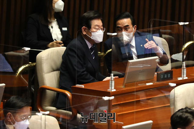 이재명 더불어민주당 대표와 박홍근 원내대표가 21일 국회에서 열린 본회의 경제 분야 대정부 질문에서 대화를 나누고 있다. (공동취재사진)