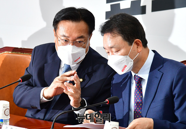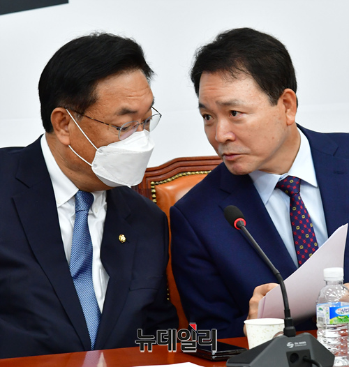 정진석 국민의힘 비상대책위원장과 성일종 정책위의장이 22일 오전 국회에서 열린 비상대책위원회의에서 대화를 나누고 있다.
