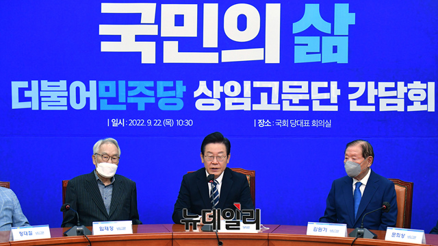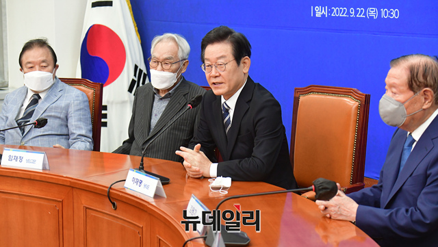 이재명 더불어민주당 대표가 22일 국회에서 열린 상임고문단 간담회에서 참석해 모두발언을 하고 있다.