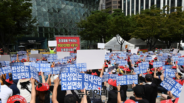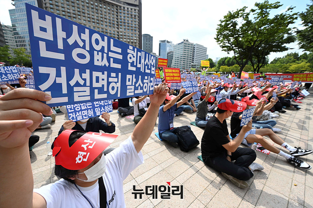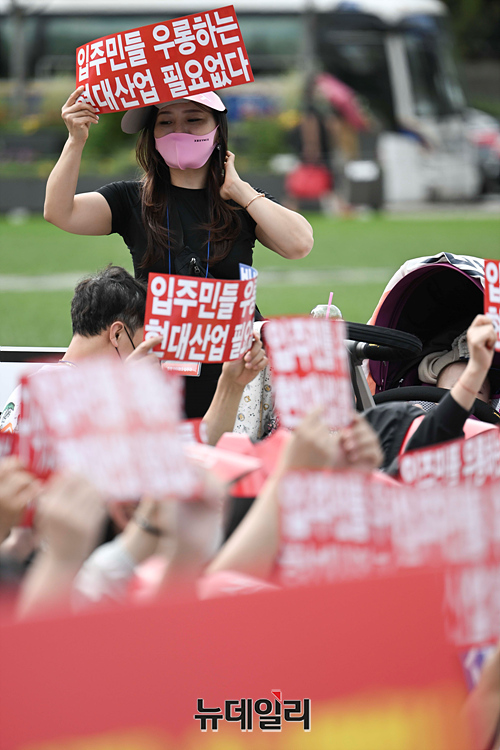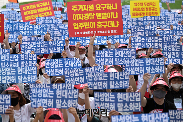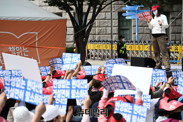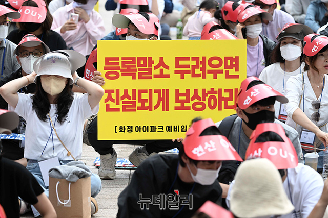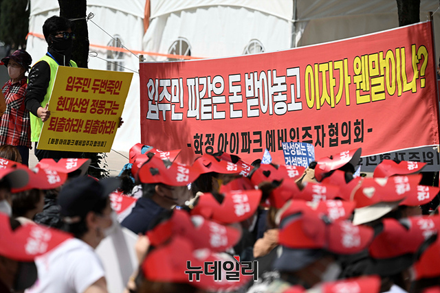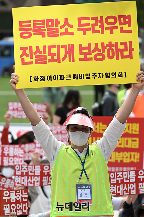 외벽 붕괴사고로 입주가 지연된 광주 화정아이파크 입주 예정자들이 22일 오후 서울시청 앞에서 열린 상경 집회에서 입주 지연배상금을 촉구하는 구호를 외치고 있다.