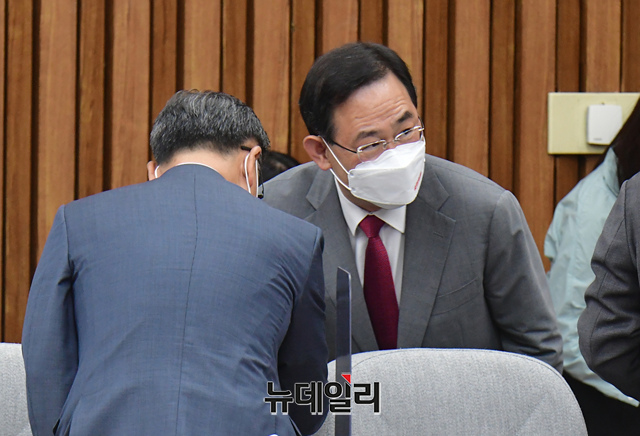 [포토] 인사 나누는 주호영 국민의힘 원내대표