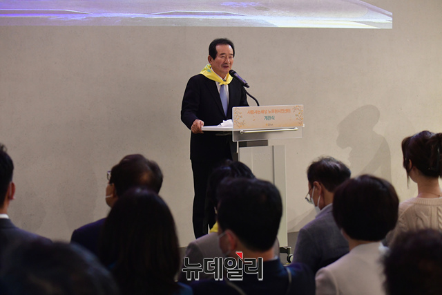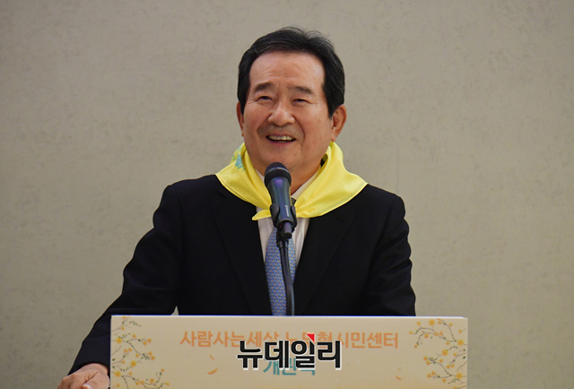 정세균 노무현재단 이사장이 23일 오후 서울 종로구 노무현시민센터에서 열린 노무현 시민센터 개관식에 참석해 인사말을 하고 있다.