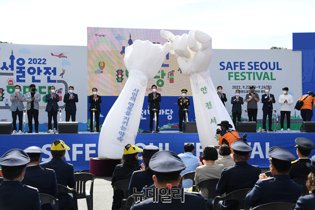 오세훈 서울시장이 23일 오후 서울 여의도공원에서 소방재난본부 주최로 열린 2022 서울안전한마당 행사에 참석해 소방차량에 소방안전 메시지를 작성하고 있다. (사진=서울시)