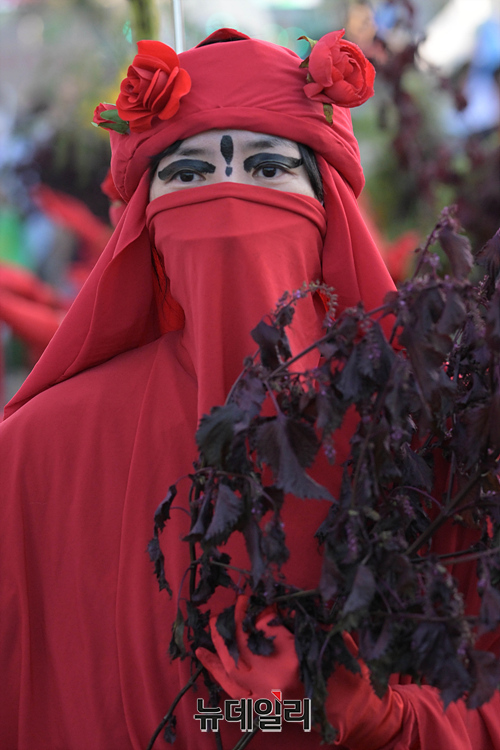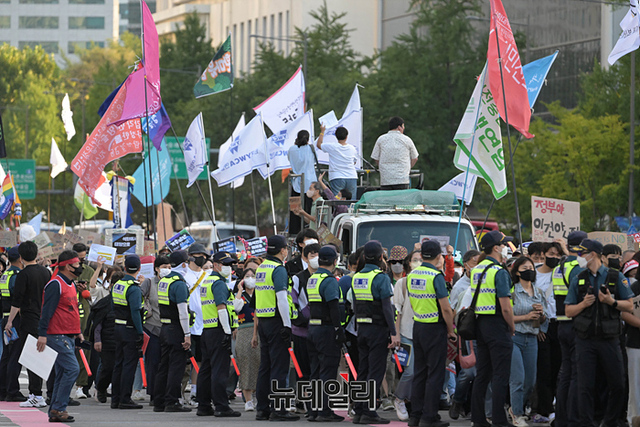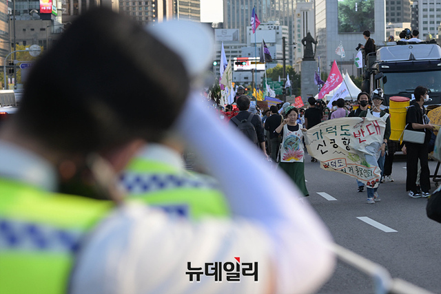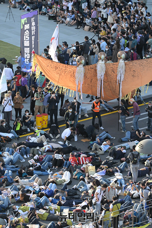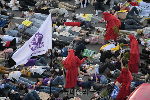 민노총과 기후위기비상행동 등이 24일 오후 서울 광화문 광장 인근에서 윤석열 정부의 노동 정책 규탄과 기후 위기를 알리는 가두행진을 하고 있다.