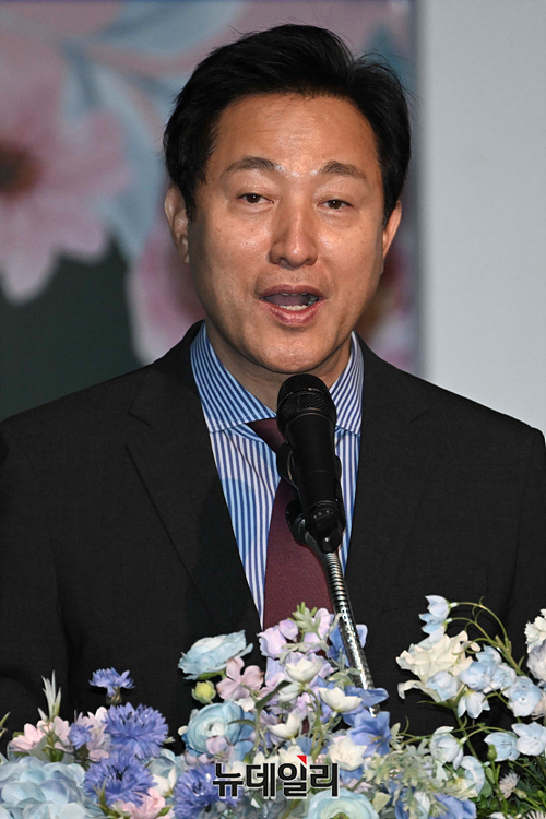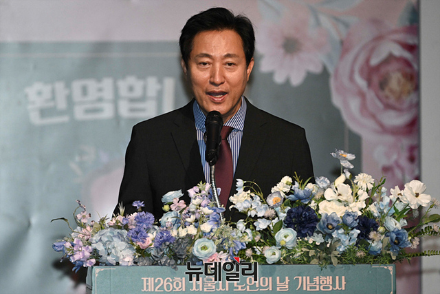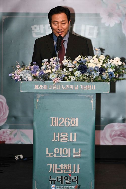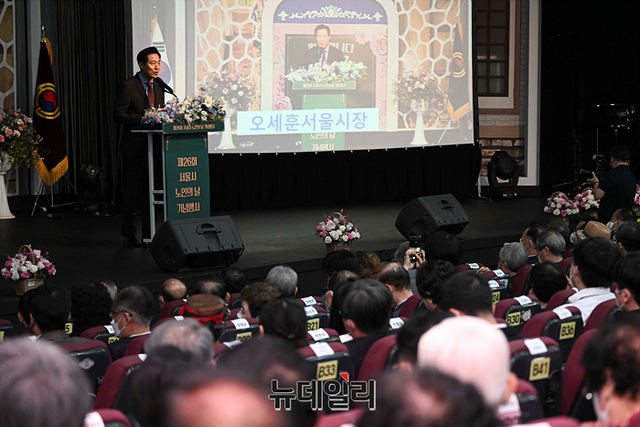 오세훈 서울시장이 26일 오전 서울 종로구 실버영화관에서 열린 제26회 노인의날 기념식에서 축사를 하고 있다.