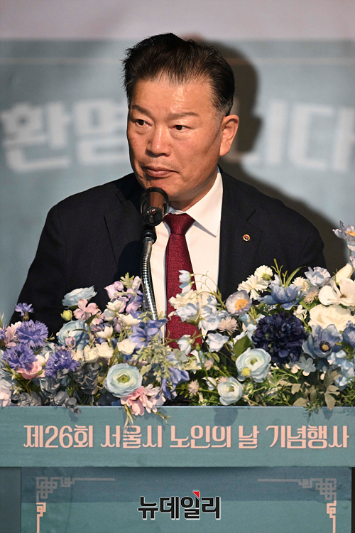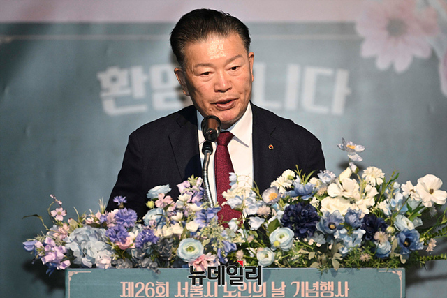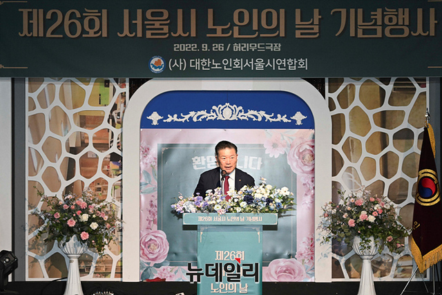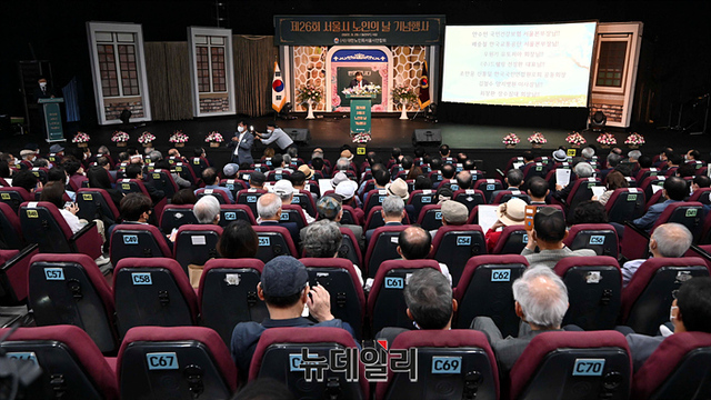 고광선 대한노인회 서울시연합회 회장이 26일 오전 서울 종로구 실버영화관에서 열린 제26회 노인의날 기념식에서 인사말을 하고 있다.