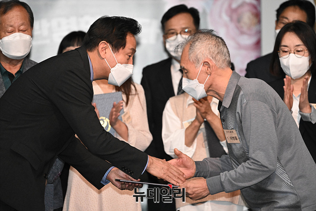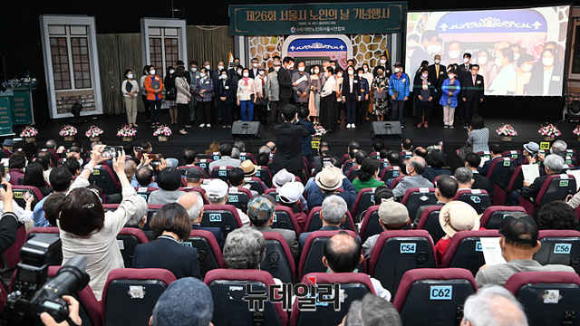 오세훈 서울시장이 26일 오전 서울 종로구 실버영화관에서 열린 제26회 서울시 노인의 날 기념행사에서 노인회 관계자에게 표창장을 시상하고 있다.