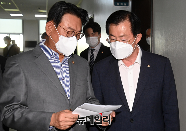 국회 행정안전위원회 이만희 국민의힘 간사와 김교흥 더불어민주당 간사가 26일 국회에서 열린 행정안전위원회 전체회의에서 2022년도 국정감사 증인 및 참고인 출석과 관련한 의견을 나누던 중 용혜인 기본소득당 의원의 이야기를 듣고 있다. (공동취재사진)