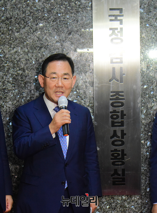 [포토] 국정감사 종합상황실 현판식서 발언하는 주호영