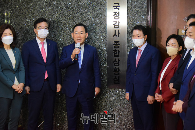 주호영 국민의힘 원내대표가 27일 오전 국회에서 열린 국정감사 종합상황실 현판식에서 인사말을 하고 있다.