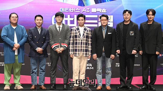 최용호 갤럭시코퍼레이션 대표, 홍동명 지식재산최고책임자, 개그맨 이용진, 유세윤, 가수 김현철, 개그맨 이진호, 가수 이지훈이 27일 오전 서울 강남구 조선팰리스호텔에서 열린 TV조선 새예능 '아바드림' 시사회 및 제작발표회에서 포즈를 취하고 있다.