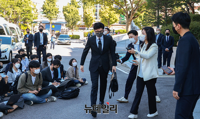 한동훈 법무부 장관이 27일 오후 서울 종로구 헌법재판소에서 열린 '검수완박' 법안의 위헌 여부를 판단하기 위한 공개변론에 이동하고 있다.