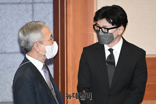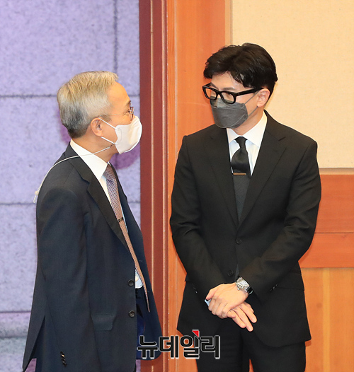 [포토] 공개변론 앞서 대화 나누는 한동훈·강일원