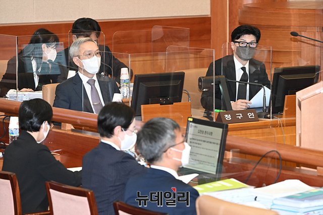 한동훈 법무부 장관과 법무부 측 소송 대리인 강일원 전 헌법재판관이 27일 오후 서울 종로구 헌법재판소 대심판정에서 열린 '검수완박' 법안의 위헌 여부를 판단하기 위한 공개변론에 참석해 대화를 나누고 있다.