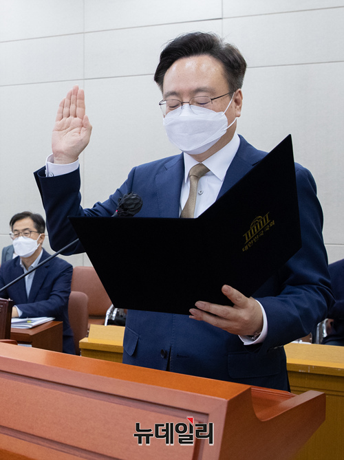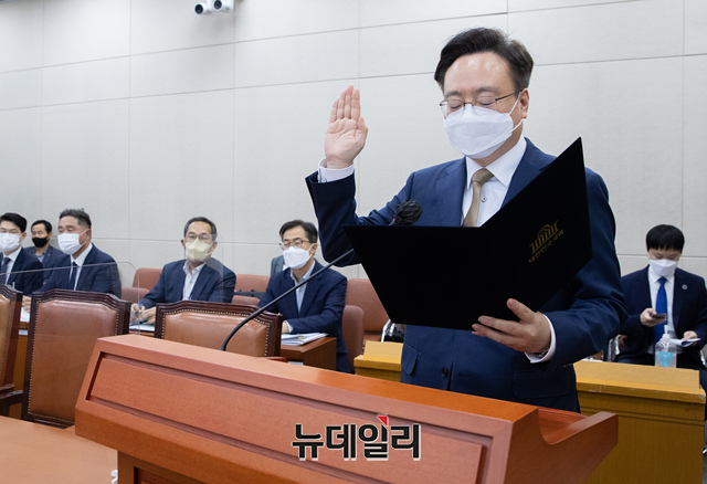 조규홍 보건복지부 장관 후보자가 27일 오후 국회에서 열린 보건복지위원회의 인사청문회에서 선서를 하고 있다. (공동취재사진)