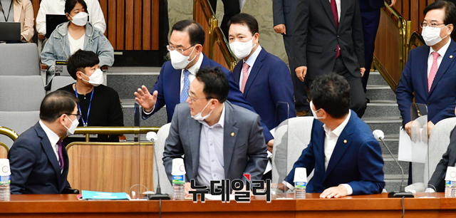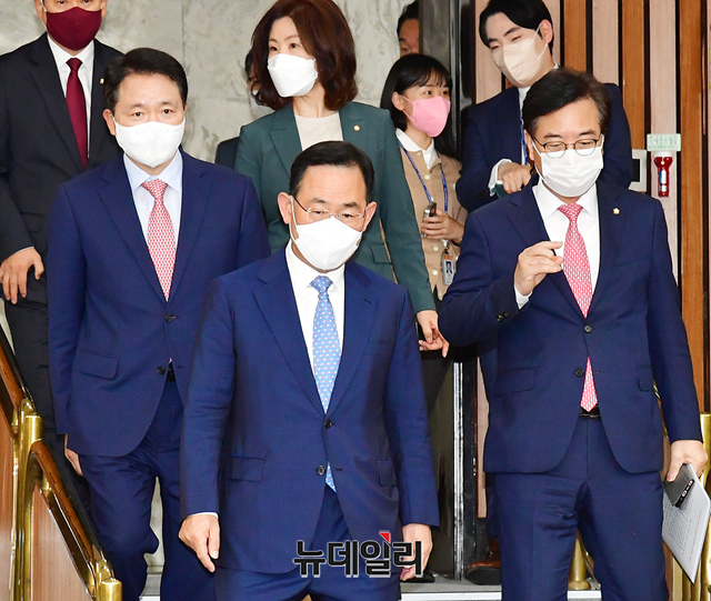 주호영 국민의힘 원내대표가 27일 국회에서 열린 국정감사 사전점검회의에 참석하기 위해 입장하고 있다.
