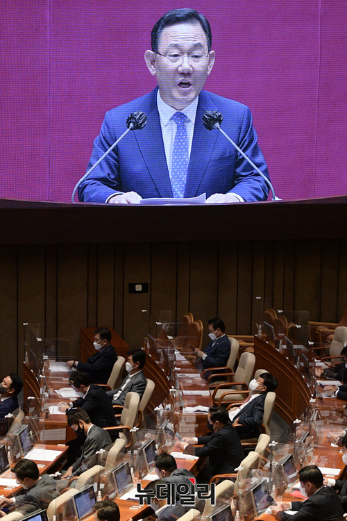 국회 운영위원장으로 선출된 주호영 국민의힘 원내대표가 27일 오후 국회 본회의장에서 수락연설을 하고 있다. (공동취재사진)