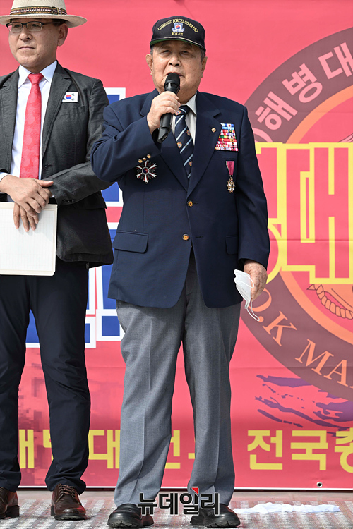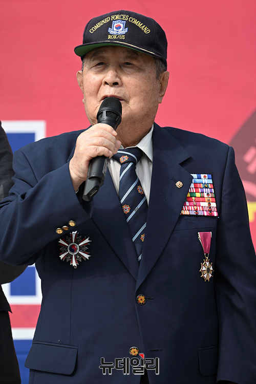 이상훈 전 국방부 장관이 28일 오후 서울 중구 서울광장에서 열린 제72주년 9.28 수도 탈환 기념행사에서 개회사를 하고 있다.