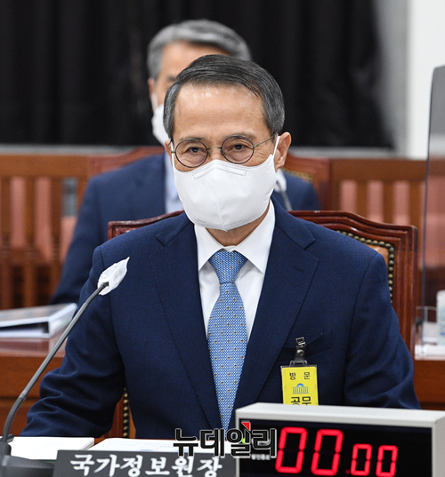 김규현 국가정보원장이 28일 서울 여의도 국회에서 열린 정보위원회 전체회의 참석해 회의 준비를 하고 있다. (공동취재사진)