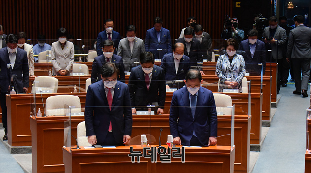 [포토] 국민의례하는 주호영 국민의힘 원내대표