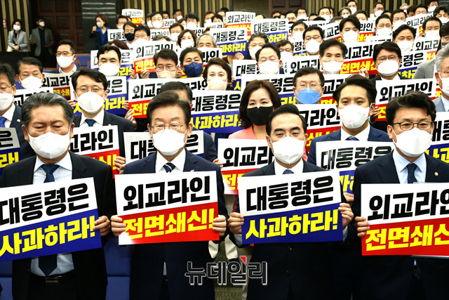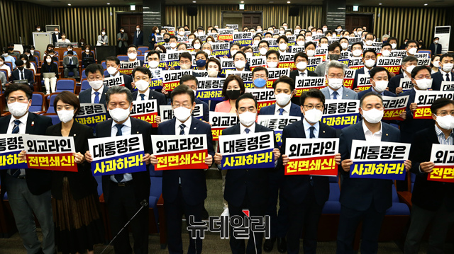 이재명 더불어민주당 대표와 박홍근 원내대표를 등 소속 의원들이 29일 국회에서 열린 의원총회에서 '외교라인 전면쇄신' 피켓을 들고 구호를 외치고 있다.