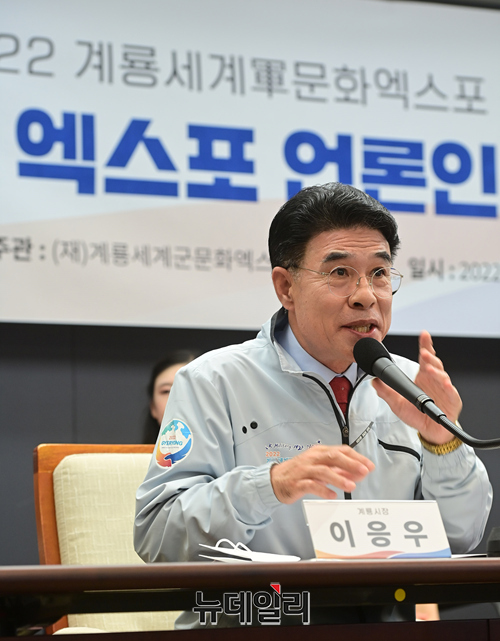 이응우 계룡시장이 29일 오후 서울 중구 한국프레스센터에서 열린 '2022 계룡세계군문화엑스포' 기자간담회에서 인사말을 하고 있다.