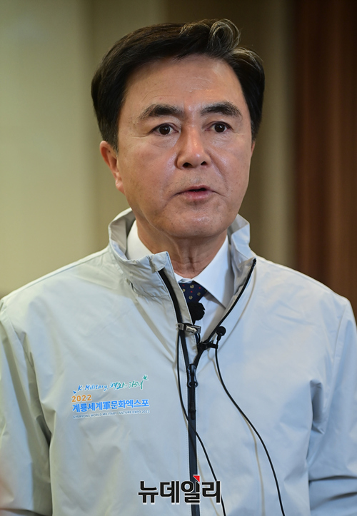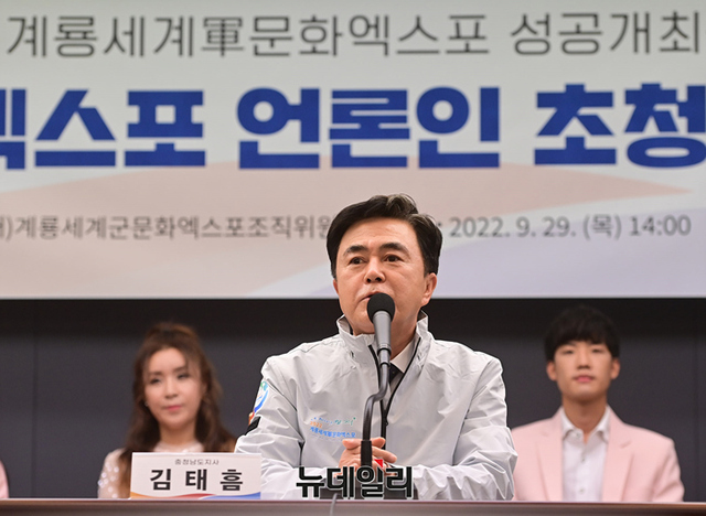 김태흠 충남지사가 29일 오후 서울 중구 한국프레스센터에서 열린 '2022 계룡세계군문화엑스포' 기자간담회에서 인사말을 하고 있다.