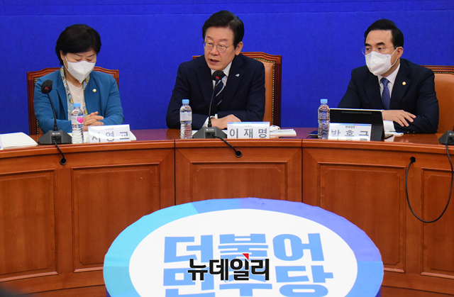 이재명 더불어민주당 대표가 29일 국회에서 열린 서울·강원 예산정책협의회에서 인사말을 하고 있다.