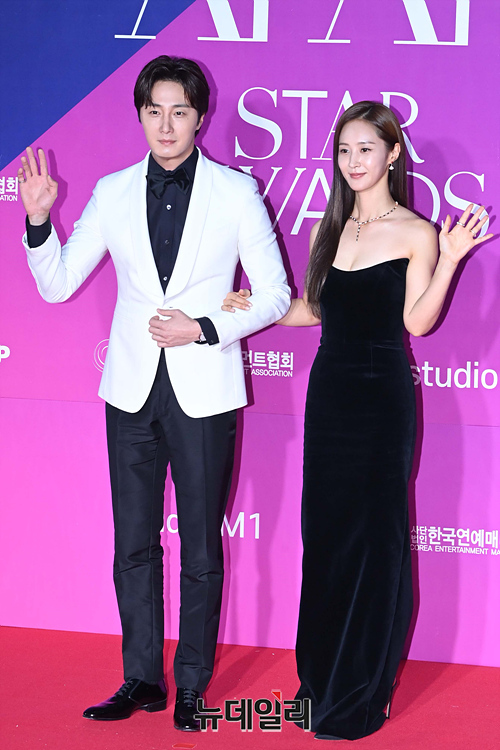 배우 정일우, 권유리가 29일 오후 경기 고양시 일산 킨텍스에서 열린 '2022 에이판 스타 어워즈(APAN Star Awards)' 레드카펫에서 포즈를 취하고 있다.