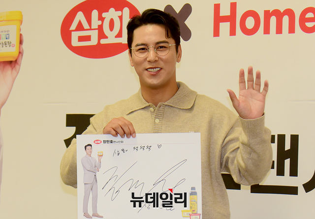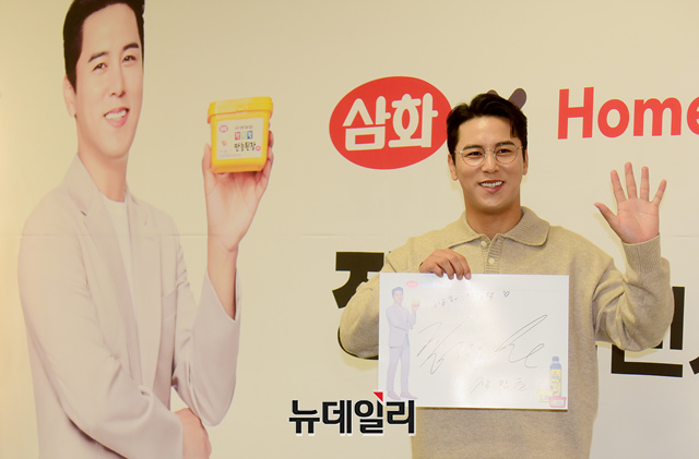 트로트 가수 장민호가 2일 오후 서울 홈플러스 강서점에서 열린 '삼화X홈플러스' 리뉴얼 오픈 기념 팬사인회 행사에 사인을 들어 보이고 있다.