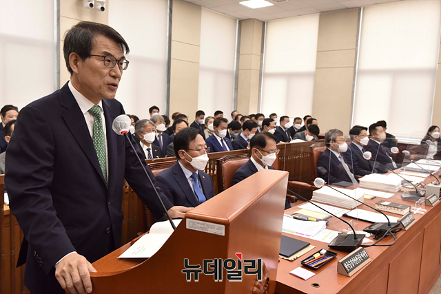 노태악 중앙선거관리위원회 위원장이 5일 오전 국회에서 열린 행정안전위원회의 중앙선거관리위원회에 대한 2022년도 국정감사에서 인사말을 하고 있다.