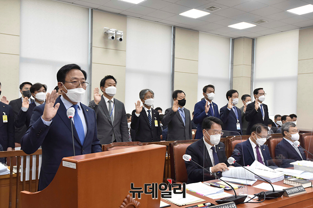이용표 한국승강기안전공단 이사장이 5일 오전 국회에서 열린 행정안전위원회의 한국승강기안전공단에 대한 2022년도 국정감사에서 증인 선서를 하고 있다.