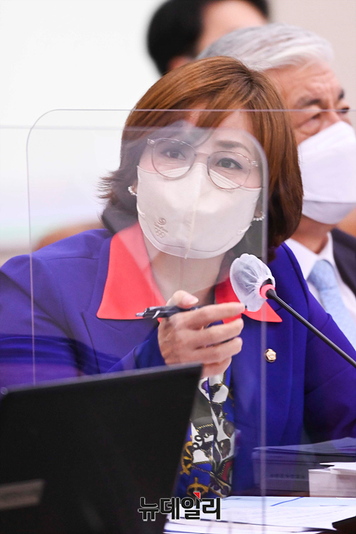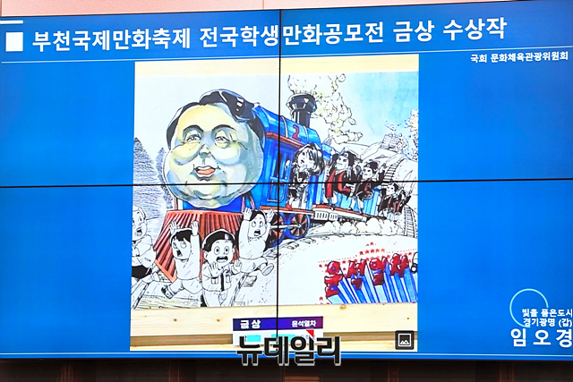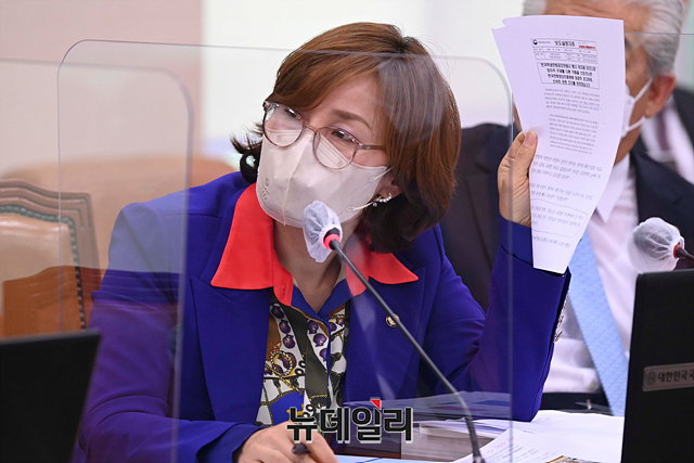 임오경 더불어민주당 의원이 5일 오전 국회에서 열린 문화체육관광위원회의 문화체육관광부에 대한 2022년도 국정감사에서 윤석열 대통령 풍자만화 '윤석열차' 수상작 관련 자료를 갖고 박보균 장관에게 질의를 하고 있다.