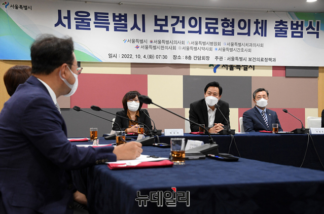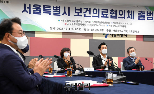 서울시 주관으로 열린 이날 출범식은 오 시장을 비롯해 박명하 서울시의사회장, 고도일 서울시병원회장, 김민겸 서울시치과의사회장, 박성우 서울시한의사회장, 권영희 서울시약사회장, 박인숙 서울시간호사회장 등이 참석했다. (사진=서울시)