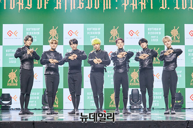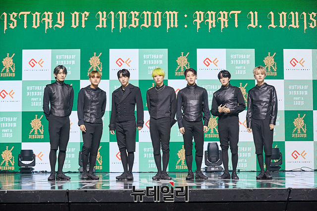 아이돌그룹 킹덤 훤(왼쪽부터), 자한, 단, 아서, 무진, 루이, 아이반이 5일 오후 서울 광진구 예스24 라이브홀에서 열린 다섯 번째 미니앨범 '히스토리 오브 킹덤:파트 5. 루이' 발매기념 쇼케이스에서 포즈를 취하고 있다. (사진=GF엔터테인먼트)