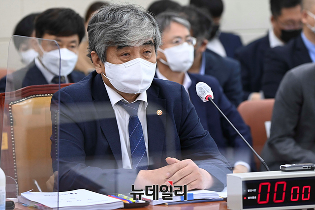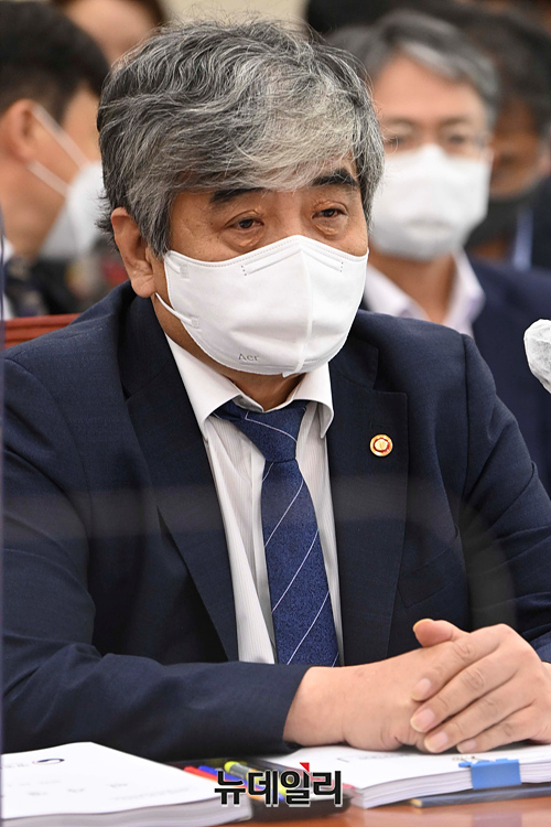 한상혁 방송통신위원장이 6일 오전 국회에서 열린 과학기술정보방송통신위원회의 방송통신위원회에 대한 2022년도 국정감사에서 의원들의 질의를 듣고 있다.