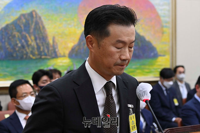 이상국 메르세데스 벤츠코리아 부사장이 7일 오후 국회에서 열린 정무위원회의 공정거래위원회, 한국공정거래조정원, 한국소비자원 등에 대한 2022년도 국정감사에서 증인으로 참석해 의원들의 질의를 듣고 잠시 눈을 감고 있다.