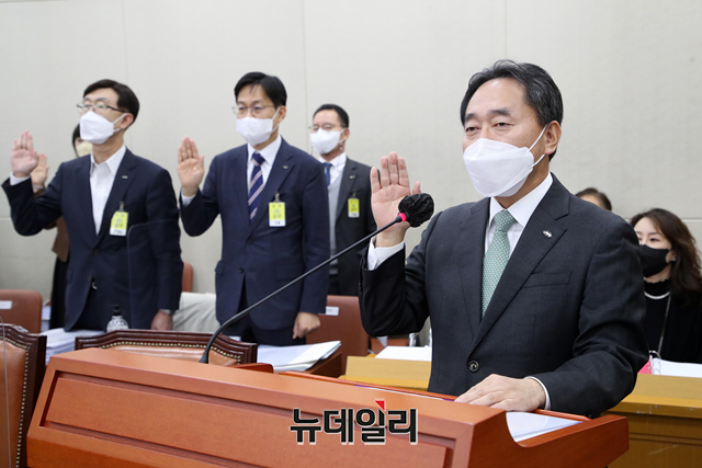 김태현 국민연금공단 이사장과 노대명 한국사회보장정보원장이 11일 국회에서 열린 보건복지위원회의 국민연금공단과 한국사회보장정보원에 대한 국정감사에서 선서를 하고 있다. (공동취재사진)