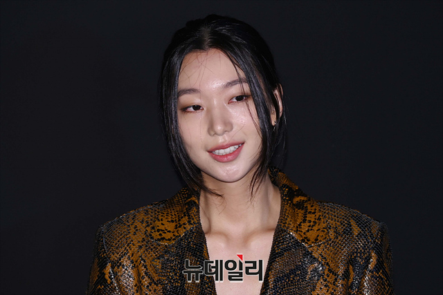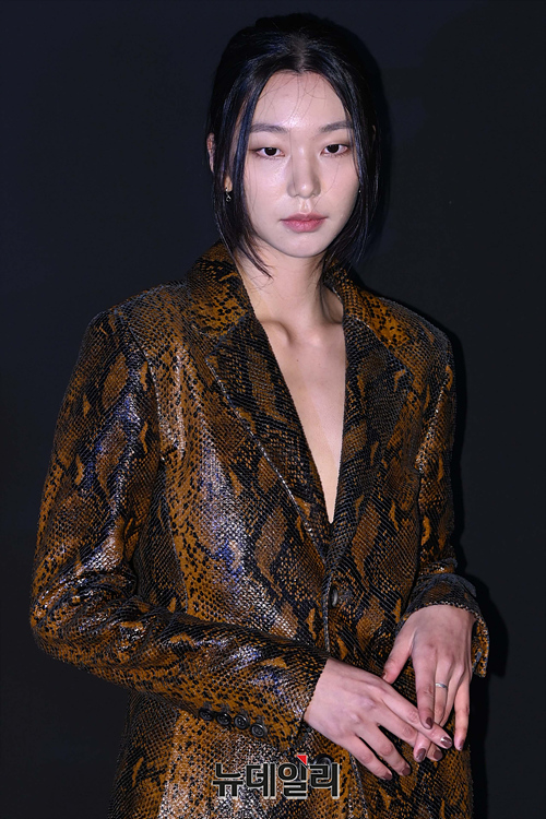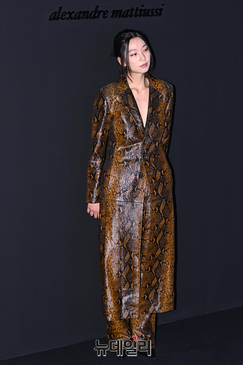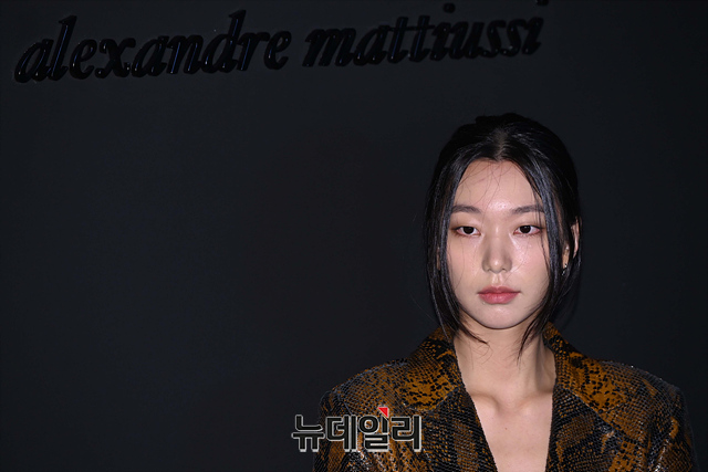 모델 이호정이 11일 오후 서울 종로구 광화문광장 육조마당에서 열린 아미 패션쇼 행사에서 포즈를 취하고 있다.