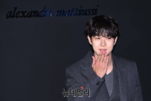 배우 최우식이 11일 오후 서울 종로구 광화문광장 육조마당에서 열린 아미 패션쇼 행사에서 포즈를 취하고 있다.