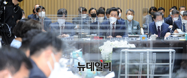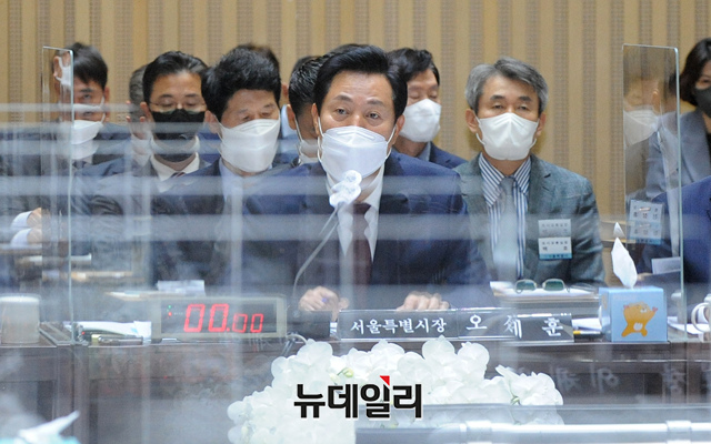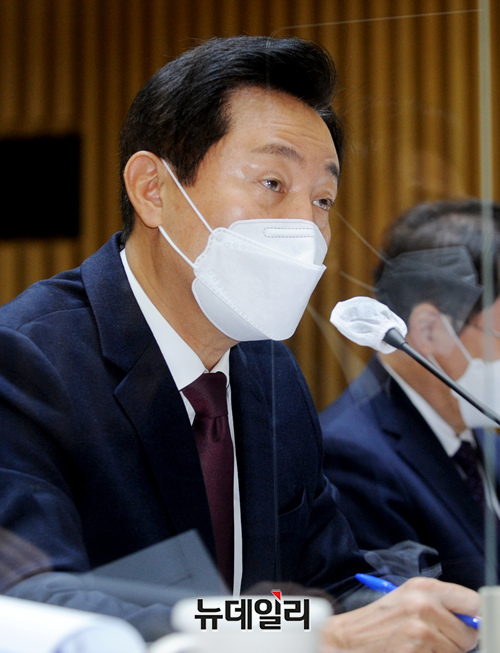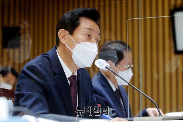 오세훈 서울시장이 12일 오전 서울시청에서 열린 국회 행정안전위원회의 서울시에 대한 국정감사에 인사말을 하고 있다.