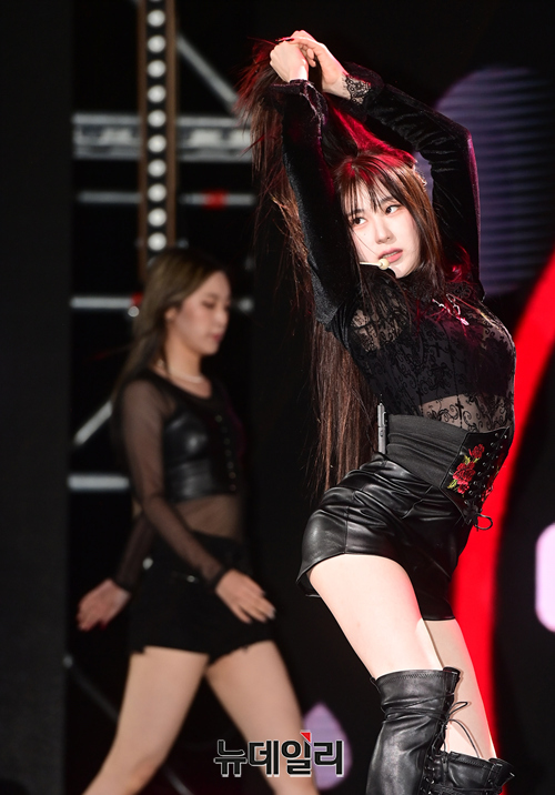 아이즈원 이채연이 12일 오후 서울 광진구 예스24라이브홀에서 열린 솔로 데뷔앨범 'HUSH RUSH(허쉬 러쉬)' 쇼케이스에서 타이틀곡 무대를 선보이고 있다.
