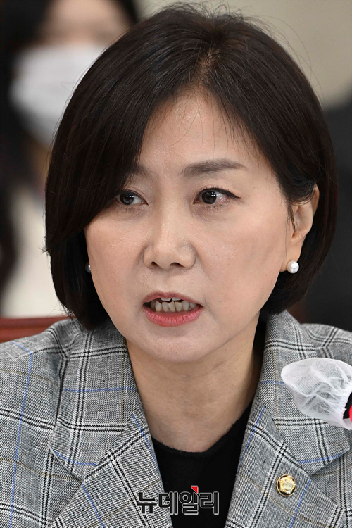허은아 국민의힘 의원이 13일 오전 국회에서 열린 과학기술정보방송통신위원회의 방송문화진흥회, 한국방송광고진흥공사에 대한 2022년도 국정감사에서 피감기관장들에게 질의를 하고 있다.