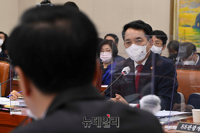 박민식 국가보훈처장이 13일 오전 국회에서 열린 정무위원회의 국가보훈처에 대한 2022년도 국정감사에서 의원들의 질의에 답변하고 있다.