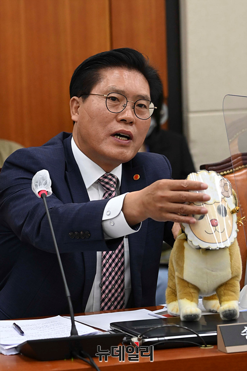 송석준 국민의힘 의원이 13일 오전 국회에서 열린 정무위원회의 국민권익위원회, 국가보훈처, 한국보훈복지의료공단, 독립기념관, 88관광개발에 대한 2022년도 국정감사에서 양의 탈을 쓴 개(대똥이)를 갖고 질의를 하고 있다.