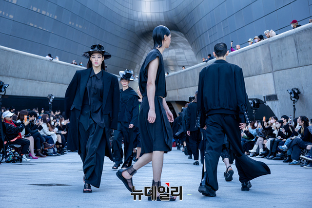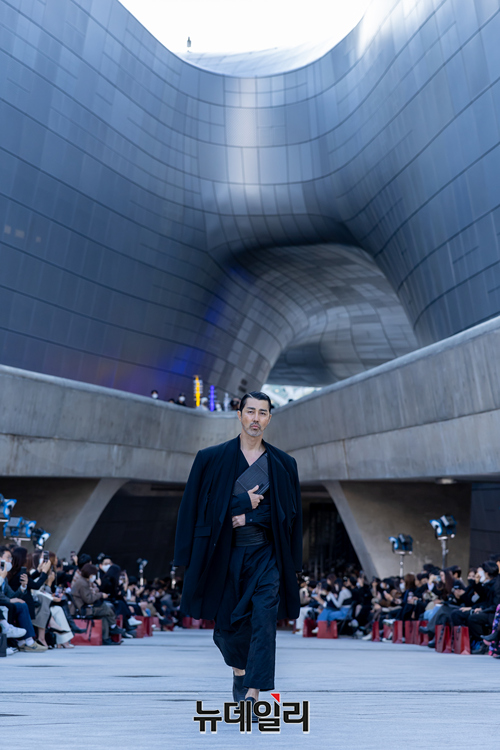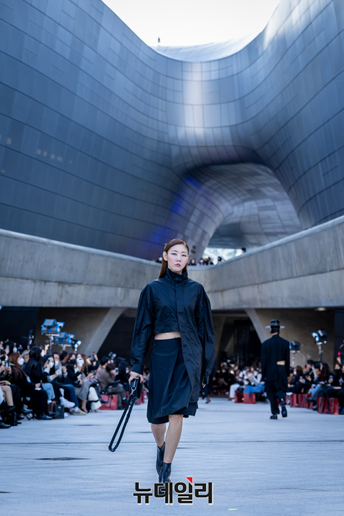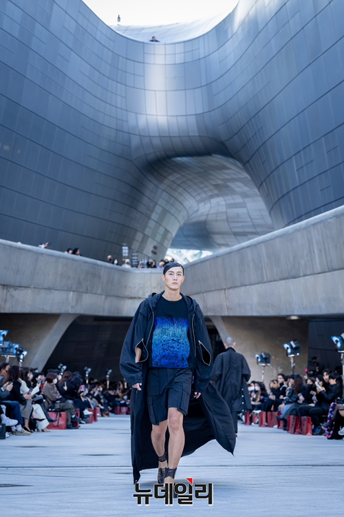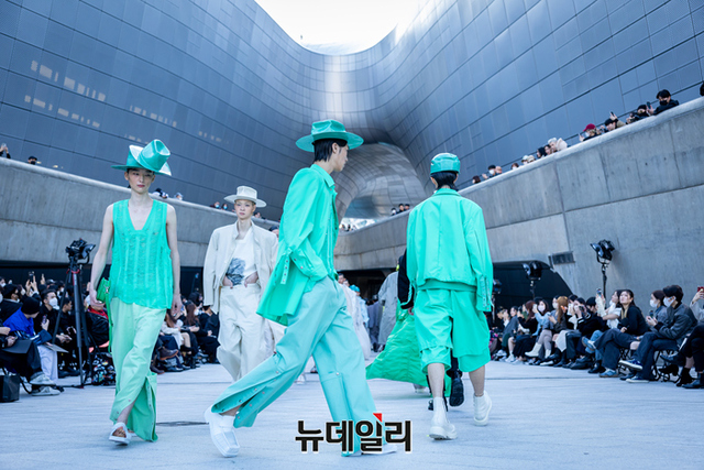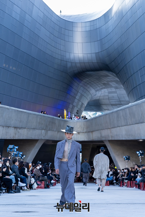 패션브랜드 송지오(SONGZIO)가 11일 오후 서울 중구 동대문디자인플라자에서 3년만에 오프라인으로 돌아온 23S/S 서울패션위크 개막쇼에서 런웨이를 선보이고 있다.