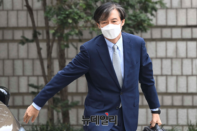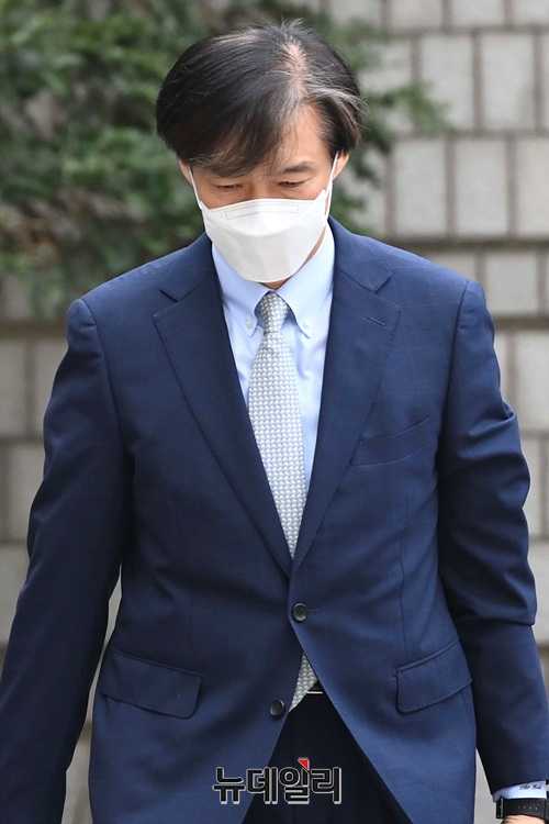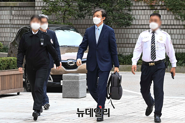 뇌물수수 등 혐의를 받고 있는 조국 전 법무부 장관이 14일 오전 서울 서초구 중앙지법에서 열린 공판에 출석하고 있다.