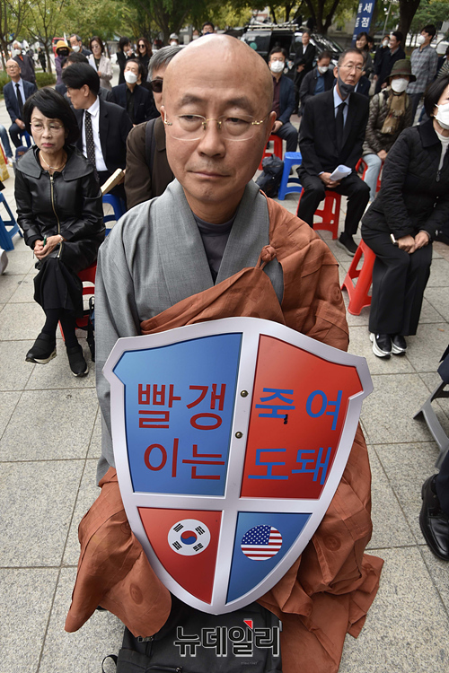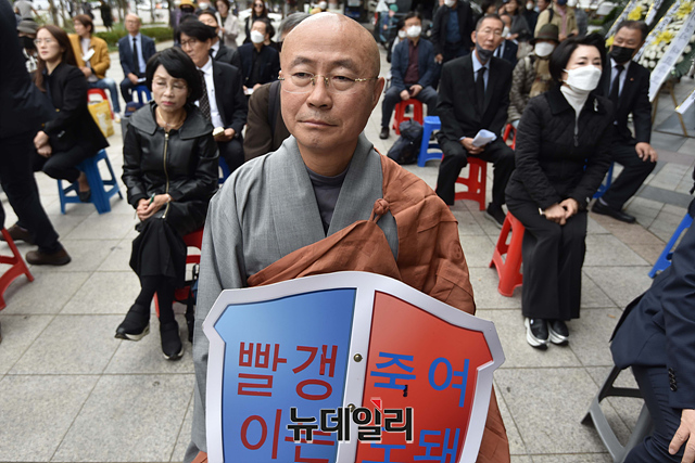 성호 스님이 14일 오전 서울 종로구 동화면세점 앞에서 열린 시민운동가 고 이경자 전국학부모단체연합 상임고문 추모집회에 참석해 자리하고 있다.