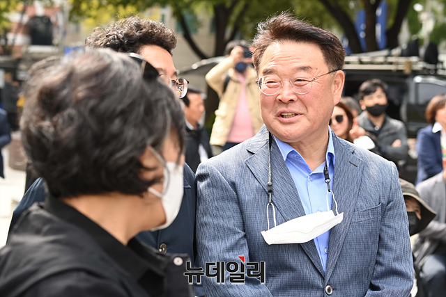 조전혁 전 국회의원이 14일 오전 서울 종로구 동화면세점 앞에서 열린 시민운동가 고 이경자 전국학부모단체연합 상임고문 추모집회에서 참석자와 대화를 나누고 있다.