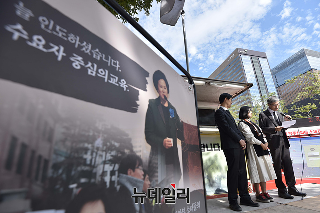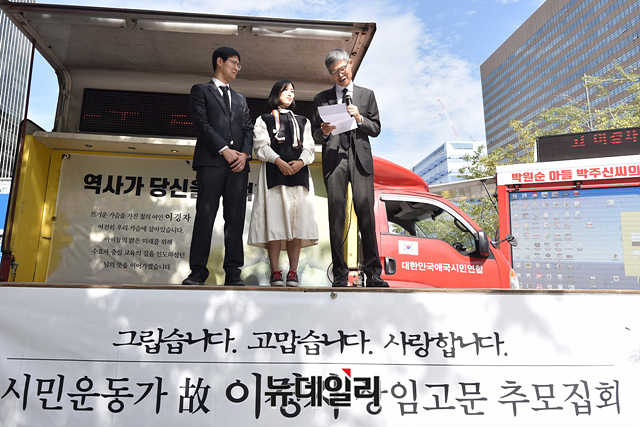 고 이경자 전국학부모단체연합 상임고문의 유족이 14일 오전 서울 종로구 동화면세점 앞에서 열린 고 이 상임고문 추모집회에서 인사말을 하고 있다.향년 66세로 별세한 고 이경자 상임고문은 공교육살리기학부모연합을 세우고 전국학부모단체연합을 창립해 초대 상임대표를 역임했다.전국학부모단체연합에 따르면 "고인은 20년 넘게 자유대한민국의 정체성과 올바른 교육을 위해 교육 운동 현장에서 힘써왔다"며 "학부모 운동의 대모로서 많은 후배 학부모 운동가들을 키웠다"고 밝혔다.
